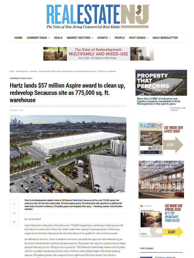 Hartz Mountain Industries will build a new 775,000-square-foot warehouse in Secaucus with the help of a nearly $57 million tax credit under New Jersey’s Aspire program, following a major environmental cleanup at the site that allows it to qualify for the incentive award.
